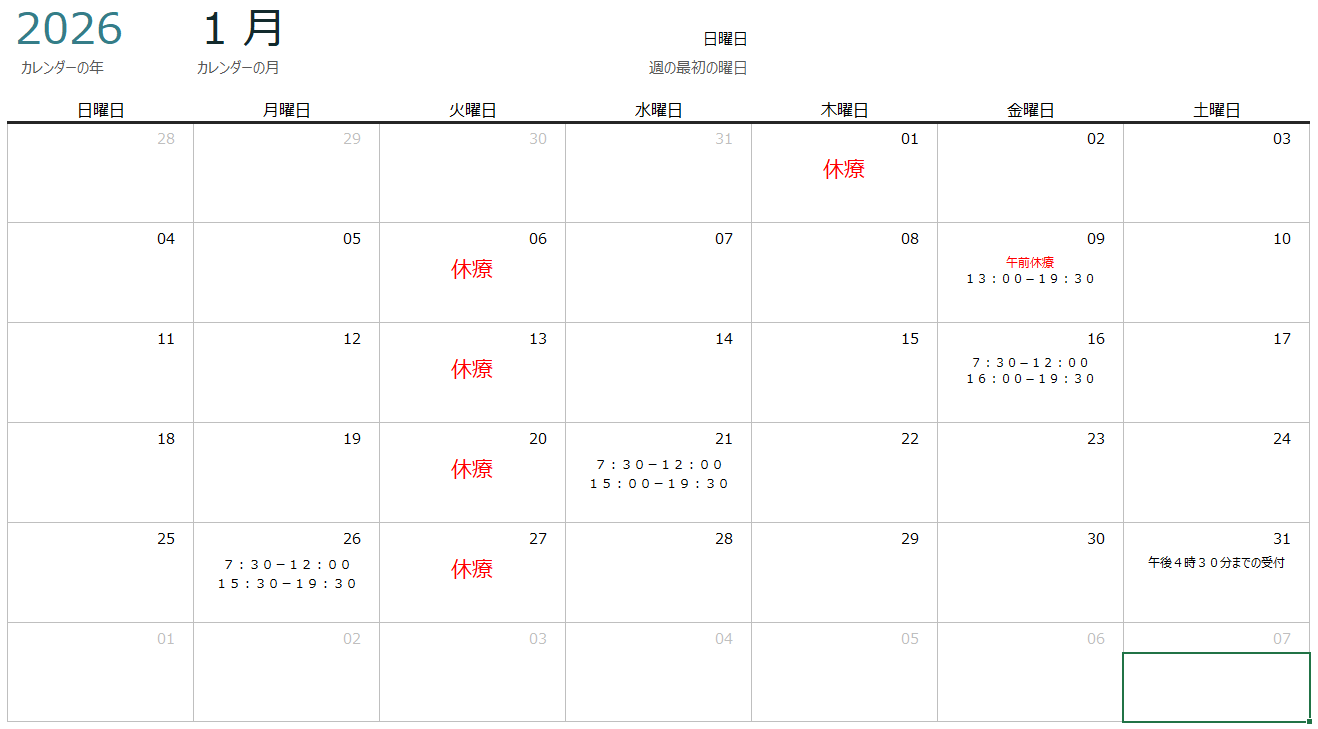 1月の予定 公開済み: 2025年12月27日更新: 2025年12月27日作成者: ゆうき整骨院カテゴリー: 未分類 12月30日から1月1日までお休み 1月9日 帝京科学大学 講師 1月16日 国保審査会 1月21日 労災審査会 1月26日 協会けんぽ審査会 1月31日 理事会 関連記事 29 9月の予定 公開済み: 2025年8月29日更新: 2025年8月29日作成者: ゆうき整骨院カテゴリー: 未分類 17 11月19日 労災審査会のため7:30-12:00 15:00-19:30 営業時間に変更がございます。 公開済み: 2025年11月17日更新: 2025年11月17日作成者: ゆうき整骨院カテゴリー: 未分類 26 11月の予定 11月1日 連絡会議 11月17日 国保審査会 11月19日 労災審査会 11月20日 協会けんぽ審査会 12月4日 集団指導 公開済み: 2025年10月26日更新: 2025年10月26日作成者: ゆうき整骨院カテゴリー: 未分類